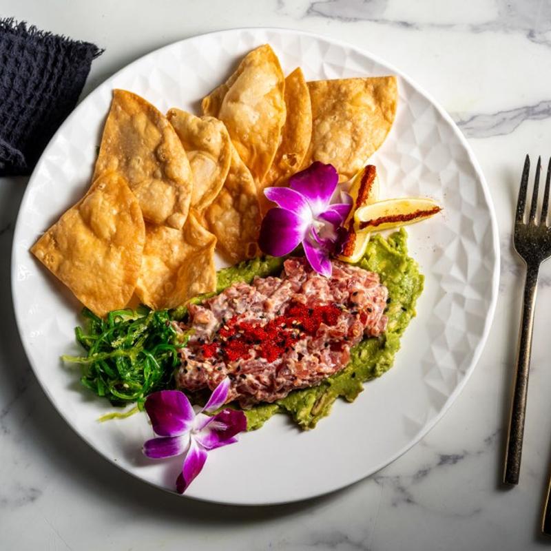 Chopped raw #1 sushi grade tuna mixed with mirin infused ginger sauce, served over fresh avocado mesh and topped with Masago and sesame seeds served with toasted pita